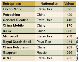 Voici un tableau des 10 premières capitalisations boursières en 2007 :
